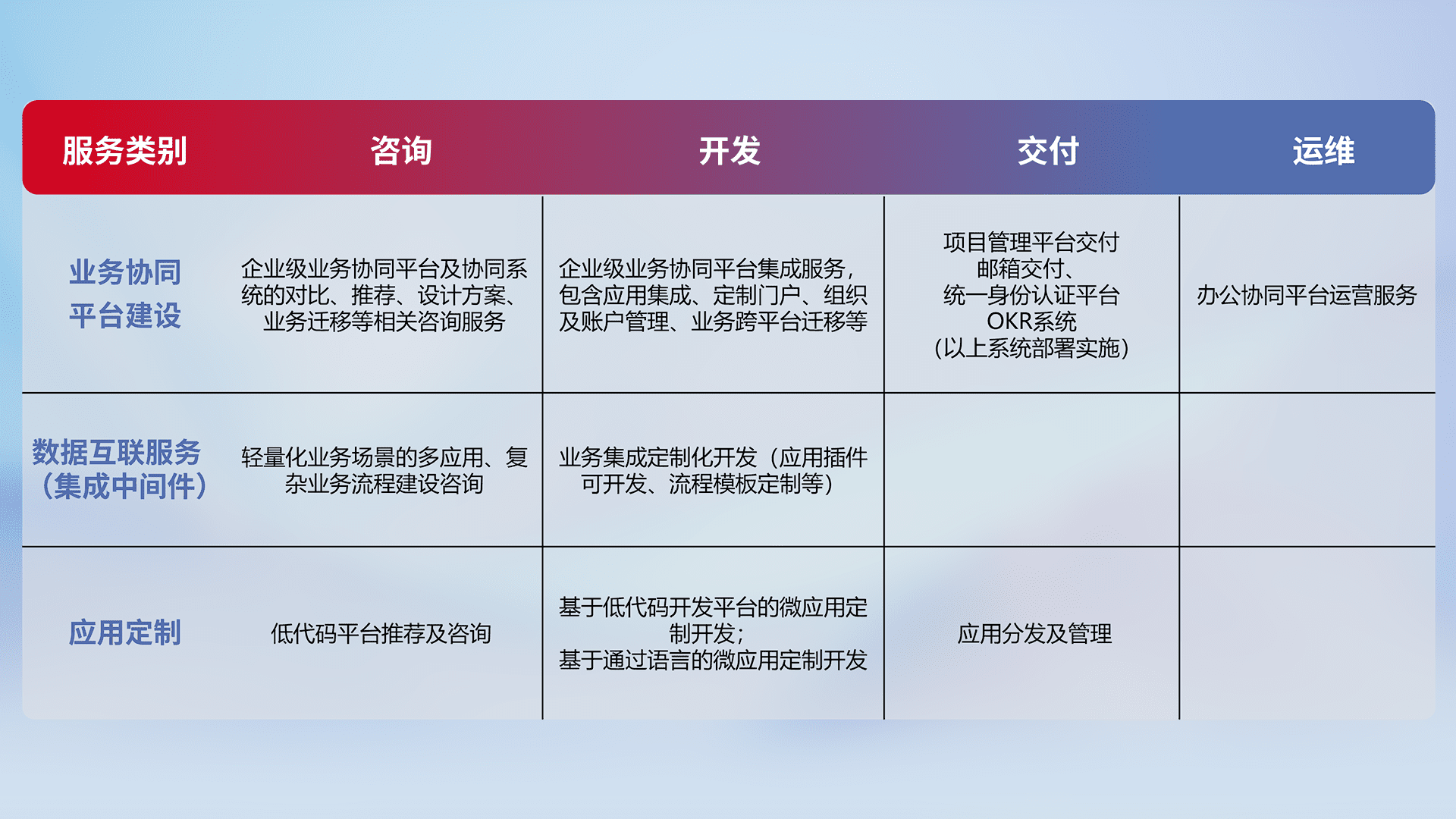 针对钉钉、、、、企微、、、、IDaas等平台级产品提供产品的规划、、、方案、、交付、、、、定制化开发等服务,,实现如统一协同办公、、、、智能客户服务、、混合会议管理、、智能数据查询、、、等业务场景,,,实现数字化转型。。。。